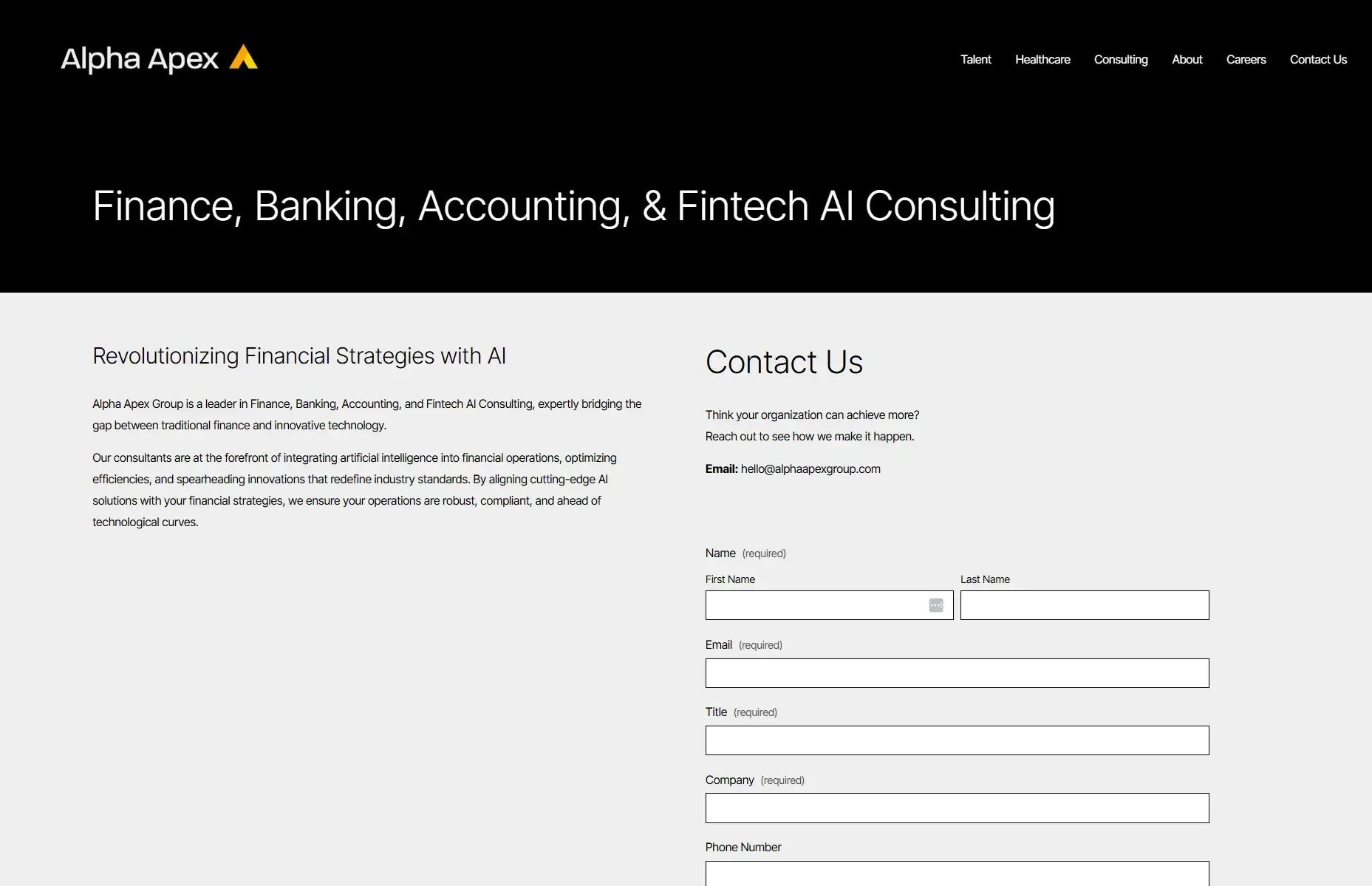 Alpha Apex Group is at the vanguard of consulting for finance, banking, accounting, and fintech sectors, leveraging advanced artificial intelligence technologies to transform traditional practices. Their expertise helps clients enhance operational efficiency, boost financial performance, and maintain competitive advantage in a rapidly evolving digital landscape.