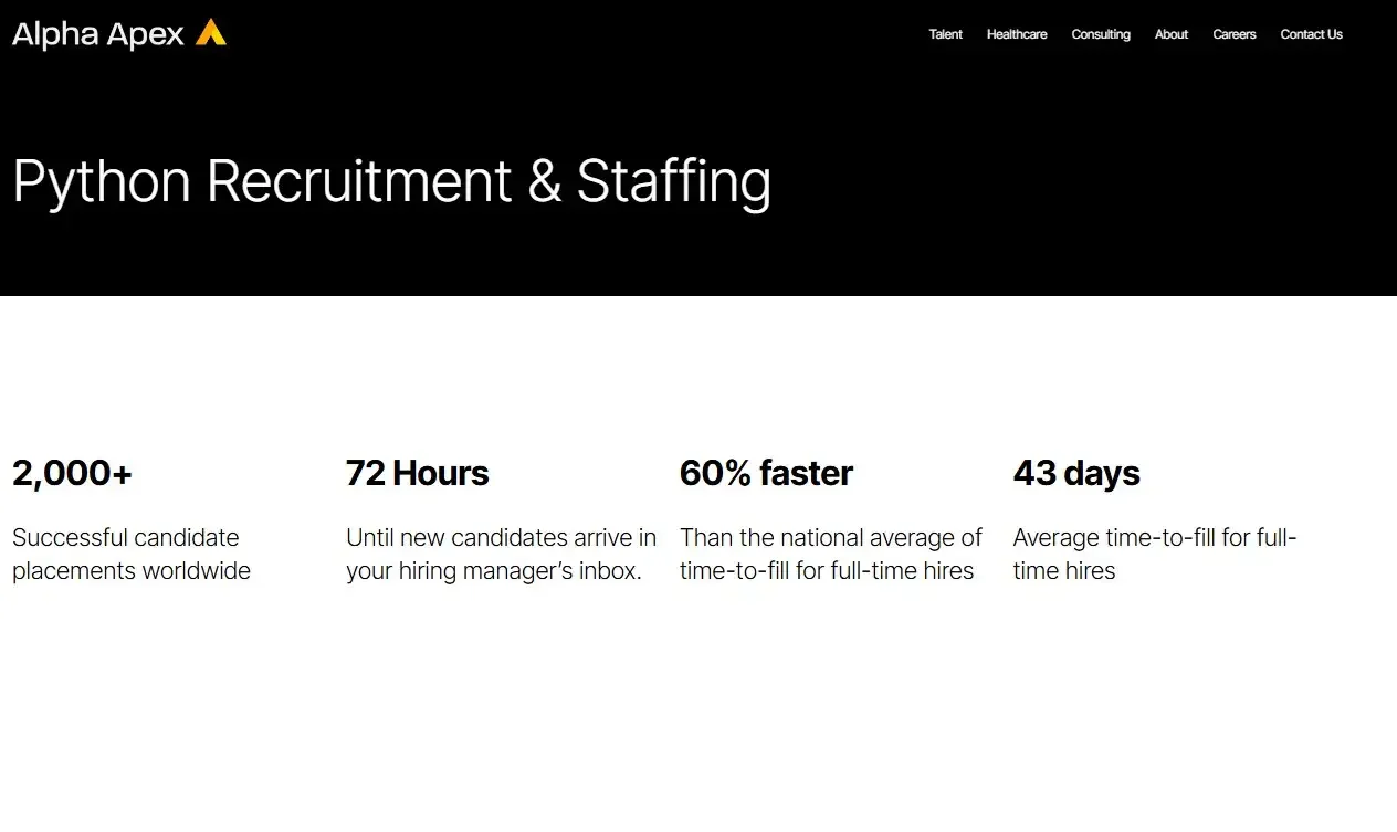Alpha Apex Group: Alpha Apex Group excels as a premier tech talent acquisition firm, specializing in sourcing top-tier Python developers. With tailored recruitment strategies and a deep understanding of the programming landscape, they're the go-to partner for companies seeking to enhance their development teams.