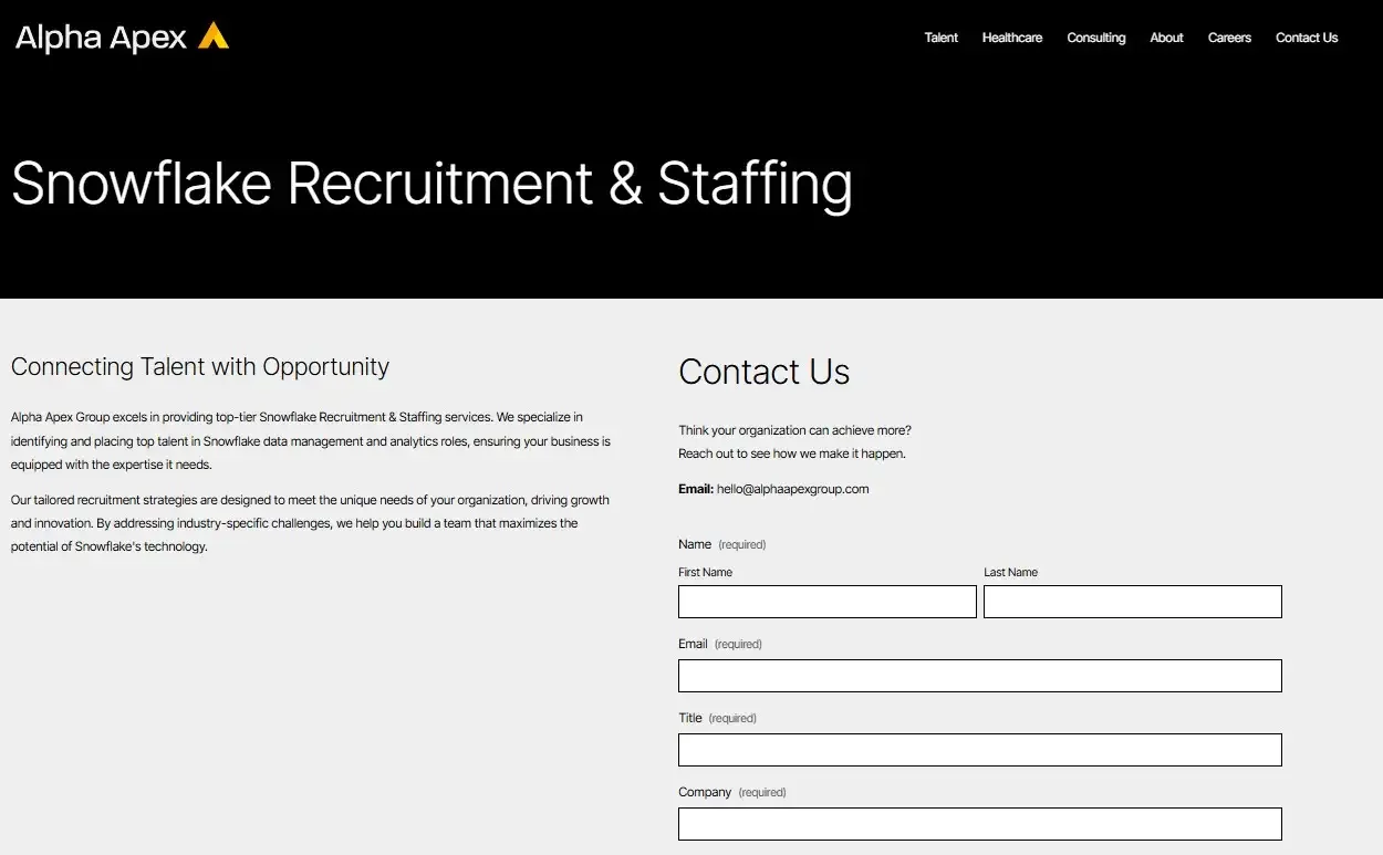 Alpha Apex Group: Alpha Apex Group excels as a premier recruiter for Snowflake professionals, providing top-notch staffing solutions to meet the growing demand for expertise in this cutting-edge data platform through specialized recruitment and comprehensive candidate screening.